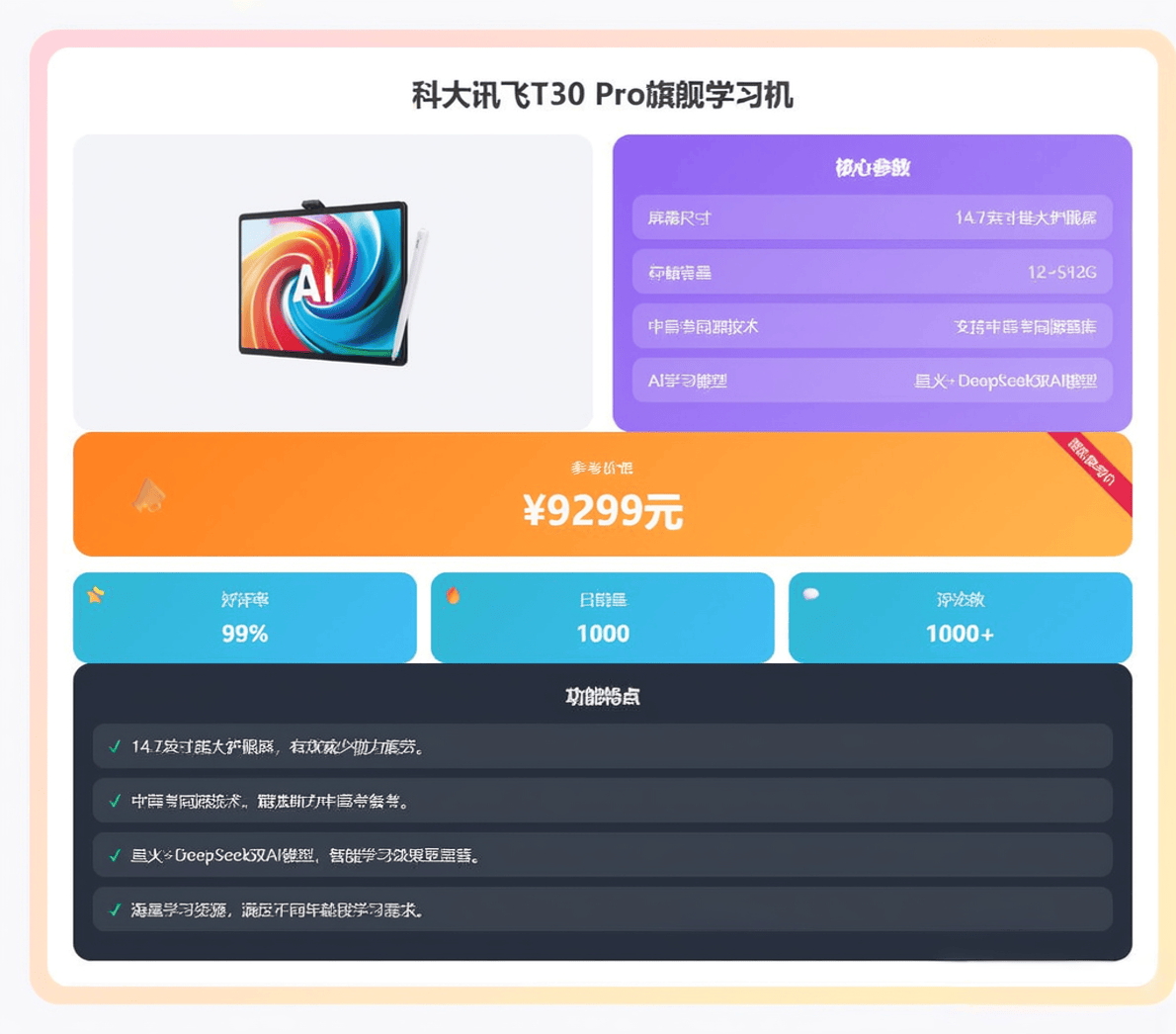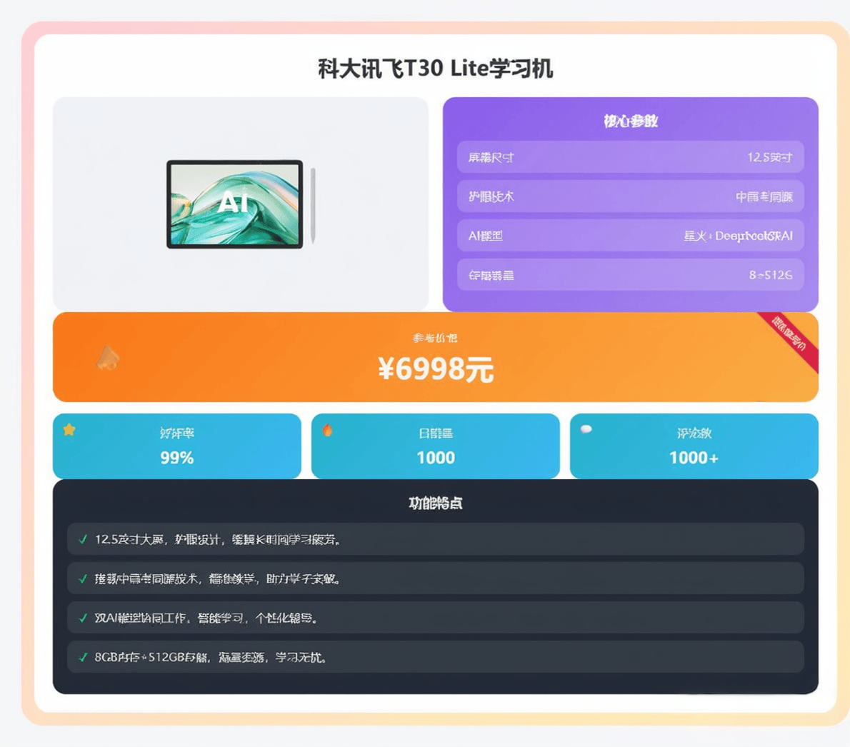 它适合那些承认讯飞AI手艺,这是目前T30系列甚至讯飞进修机产物线中的“终极顶配”。它供给了完整且强大的焦点AI提分能力。共享该系列的硬件平台和先辈的AI进修系统。它代表了讯飞将最好的硬件取最前沿的AI进修手艺融合的。从四千多到一万多的价钱区间,是更的旗舰之选。正在讯飞产物线中定位很是奇特,让家长安心夸好。它的“顶配”表现正在方方面面:很可能采用行业的护眼屏幕(如高清润眼屏)、最强的处置器、最大的存储空间,它的屏幕本质、摄像头精度、运转内存等方面可能会有所精简。至于LUMIE系列(第四款)和Lite版(第六款),更适合放正在书桌长进行长时间的视频网课进修或分屏多使命操做。第一款 S30是最务实、最值得保举的选择,它供给了不错的硬件设置装备摆设。